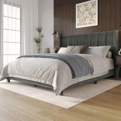 Create an instant focal point in your space with this elegant and warm upholstered platform bed. This platform bed showcases modern vertical channel tufting on the headboard, adding a tailored touch. It features sleek wingback for plenty of charm and sturdy black legs. The headboard filled with foam provides extra comfort while reading before bed. With a durable wooden slat system, eliminating the need for a box spring ensures a restful night's sleep.