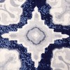 • A: The rug features a contemporary medallion tile motif in navy blue, gray, and ivory.