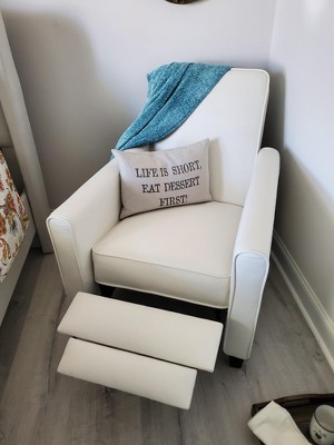 This chair is the perfect fit for my guest bedroom the color is perfect it is a nice whitish ivory and it's very comfortable. The price was outstanding and it was easy as pie to put together you only had to do two things install the legs by screwing them on and setting the reclining portion in. It's not huge either. It's the perfect size!
