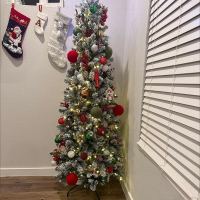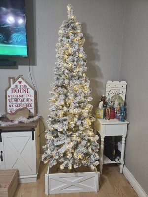 Home Imports Emporium 9ft Slim Snow Flocked Christmas Tree with Lights, Skinny Pencil Christmas Tree Prelit with 1455 Branch Tips, 500 Warm Lights