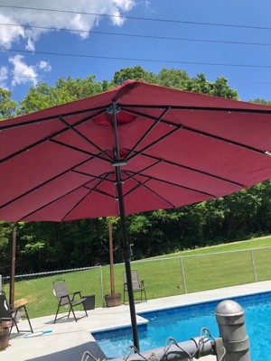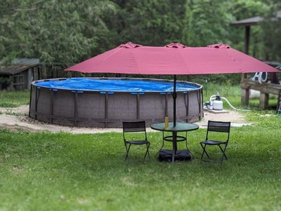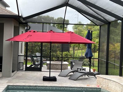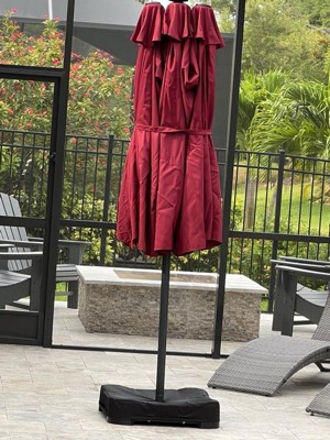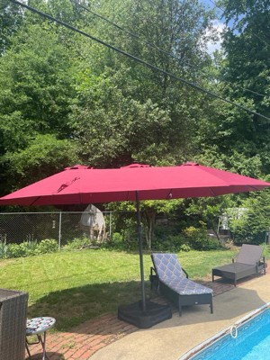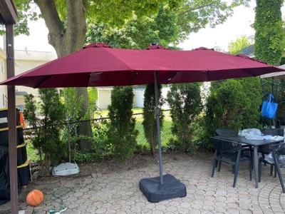 Create a comfortable, resort-style retreat with the Home Zone Living double head patio umbrella. The extra-wide 15 x 9 ft (4.6 x 2.7 m) dual canopies provide generous shade for large dining sets, lounges, or poolside seating. The included fillable base and sand bags offer up to about 213 lb (97 kg) of total weight for sturdy stability in breezy conditions. Enjoy evenings outside with 36 built-in, solar-powered LED lights that provide a warm glow without cords or batteries to replace. The vented, UV-resistant, waterproof canopy and heavy-duty steel frame are built for long-lasting performance in sun and light rain, making this umbrella a great centerpiece for your outdoor space.