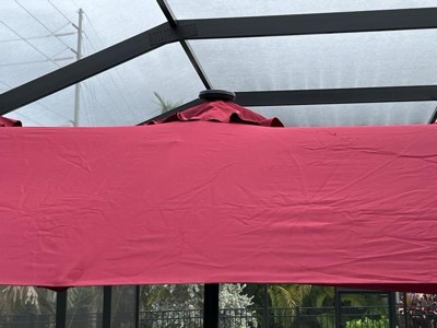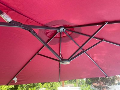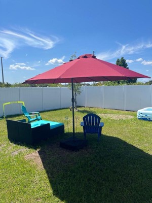 [This review was collected as part of a promotion.] This is a very nice umbrella for providing some much needed shade from the Florida sun! It seems very strong and stable, which is also very important with how strong the winds can get here. And the burgundy adds a nice pop of color to our backyard. The solar lights should be pretty cool at night time! Putting it together was a little challenging (particularly the poles into the umbrella fabric), but I had it all setup and ready for use in under an hour.