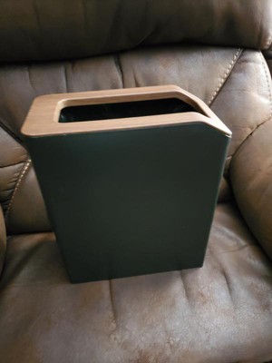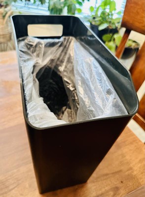 [This review was collected as part of a promotion.] I needed a slim trash can to fit under my desk, and this one fits perfectly! The design of the trash can is sleek and easy to put together. I also love that it holds the bag up on the inside ledge. It gives my trash can a tidy look! The trash can also looks more black and serene green. You wouldn't know it's green unless you shine a light on it. The best thing of all about this trash can? It comes in a two-pack! I love this trash can, and now I have a matching set!
