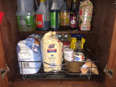 [This review was collected as part of a promotion.] I got this because I was tired of forever reaching under cabinets for things at the back and it works great! The large metal basket mounted easily to my cabinet with the included screws. The basket is a generous size and holds quite a bit. The basket is durable and a great addition to my kitchen. With this I don’t have to keep reaching back to the back of my cabinet by moving things out of the way, removing them, or knocking them over. the basket slides smoothly in and out of my cabinet, on the casters built within the side rails, so it’s an easy operation. If I had to change anything I’d add in adjustable dividers, to hold smaller items in place, but other than that this is perfect!