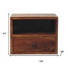 Give your room the look and feel of 5-star accommodations with this 12-inch chestnut solid wood square one drawer floating nightstand. Maximize your floor space and adjust to the exact height you need, when you add this wall-mounted design to your space. Sturdy and durable construction from solid mango wood ensures this trusty bedside table is built to last. The easy open drawer allows you hidden storage to keep your essentials close at hand. An easy-access shelf gives you additional storage and display space. The unsung hero of the bedroom, this nightstand is perfect for keeping a glass of water, lamp, alarm clock, jewelry, and more, close by and easily accessible. 9.40-inch h x 11.80-inch w x 9.80-inch d.