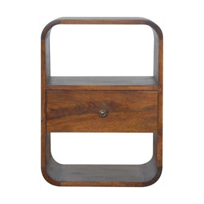 Give your room the look and feel of 5-star accommodations with this 16-inch brown solid wood round one drawer floating nightstand. Maximize your floor space and adjust to the exact height you need, when you add this wall-mounted design to your space. Sturdy and durable construction from solid mango wood ensures this trusty bedside table is built to last. Includes a drawer to help keep your essentials close by and hidden. The unsung hero of the bedroom, this nightstand is perfect for keeping a glass of water, lamp, alarm clock, jewelry, and more, close by and easily accessible. 4.30-inch h x 15.70-inch w x 12.20-inch d.