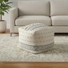 Practicality and fashion mix together with this handy 18-inch ivory cotton and wool striped pouf ottoman. Add chic style to your space with this fun pouf that not only looks cool but can be a great foot rest or extra seat when needed. Full of textural embellishments and tassels, this hand made pouf gives a cozy modern farmhouse or modern boho vibe. This ottoman is as comfortable as it is good looking and makes a multi-functional addition to your space. 14.00-inch h x 18.00-inch w x 18.00-inch d.