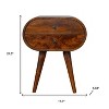 Our 21-inch chestnut solid wood oval two drawer nightstand will compliment your bed beautifully. Robust in design, the bed side table has been expertly crafted from solid mango wood. The piece has 2 drawers to store your bedtime essentials close to you as you rest. This piece is purposefully distressed to give a worn, rustic/vintage finish. The unsung hero of the bedroom, this nightstand is perfect for keeping a glass of water, lamp, alarm clock, jewelry, and more, close by and easily accessible. Nightstands are obviously great beside the bed but can be used just as easily to help battle clutter in your living room, hallway, office, or dining room. 21.30-inch h x 17.70-inch w x 13.80-inch d.