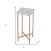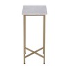 Distinctive in style the 21-inch white and gold distressed marble and iron square end table radiates a versatile charm. Quality construction from the gold iron base combines with white marble of the top to give this table a fresh and updated look. The purposefully distressed finish gives this table an authentically rustic feel. A great accent on either side of the sofa or bed, this adorable end or side table is just what you need. You can match it with other pieces to get the ideal look for your place. 21-inch h x 9-inch w x 9-inch d.
