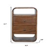 Good looking design and practical styling meet to form this 22-inch chestnut brown solid wood two drawer nightstand. Robust in design, the bed side table has been expertly crafted from solid mango wood with a unique curved edge top. This piece has 2 drawers for your storage needs. An easy-access shelf gives you additional storage and display space. The unsung hero of the bedroom, this nightstand is perfect for keeping a glass of water, lamp, alarm clock, jewelry, and more, close by and easily accessible. Versatile in use this nightstand would also work as a great end table in the living room, hallway, or office. 21.70-inch h x 15.70-inch w x 13.80-inch d.