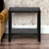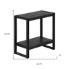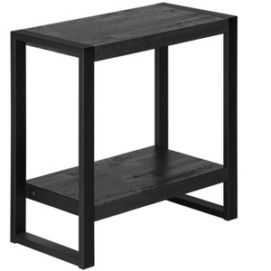 Distinctive in style the 24-inch black end table with shelf radiates a versatile charm. A sleek black monotone color gives this metal and manufactured wood table a fresh and updated look. Help to keep your space organized with the included single shelf. An ideal location for placing your snacks and drinks, and a place to keep your lamp, frames, or other accessories. You can match it with other pieces to get the ideal look for your place. 23.75-inch H x 23.75-inch W x 12-inch D