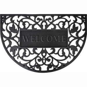 Ready to withstand heavy foot traffic, this 24-inch x 36-inch black scrollwork welcome semi circle outdoor rubber door mat is an ideal option for the front door or entrance way of your home or business. Crafted from rubber, this mat is not only functional but is a visually appealing accessory to welcome people to your home or business. Add this decorative mat to create a practical yet inviting welcome to all who enter. 24-inch h x 36-inch w x 0.5-inch d.