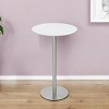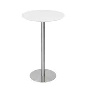 Elevate your dining experience with this modern 26-inch white and silver rounded steel bar table. Crafted with a sleek manufactured wood top in white and a sturdy steel base in silver with a glossy finish, this round table promises both style and durability. Its fixed mechanism and pedestal base type ensure stability for your bar or restaurant setting, making it a chic focal point for any space. Add a touch of contemporary charm with this elegant piece that effortlessly blends a clean white top with a metallic silver base, creating a sophisticated ambiance for your guests to enjoy. 41.3-inch h x 25.6-inch w x 25.6-inch d.