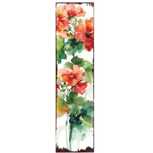 The 36-inch green red and white geranium solid wood porch sign is the perfect touch for your outdoor space. Crafted from high-quality solid wood, this durable sign ensures longevity while enhancing your porch's aesthetic appeal. Its traditional style brings a classic charm to any entryway, inviting guests with a warm and welcoming vibe. The rich colors add a vibrant splash that is ideal for expressing your personal style and enhancing curb appeal. This sign is not just a decorative piece but also a statement of hospitality. 36-inch h x 10-inch w x 1-inch d.