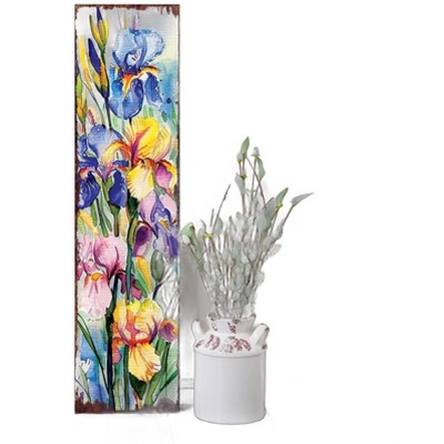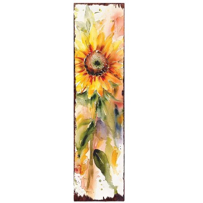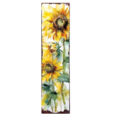 The 36-inch yellow green and brown watercolor sunflowers solid wood porch sign is a charming addition to your outdoor space. Crafted from solid wood, this porch sign boasts durability and a classic appeal. Its traditional style seamlessly blends with various garden aesthetics, enhancing your outdoor decor. The vibrant colors of brown, green, and yellow reflect the beauty of nature, making it an eye-catching piece that welcomes guests. Perfect for adding a touch of artistry to your porch or garden, this sign embodies warmth and hospitality. Elevate your outdoor ambiance with this unique accessory that complements any floral arrangement or outdoor setting beautifully. Enjoy the serene atmosphere it creates while celebrating the joys of nature. 36-inch h x 10-inch w x 1-inch d.