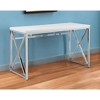 - Modern rectangular desk with a shiny finish white birch top and stylish chrome / silver colored geometric metal base.