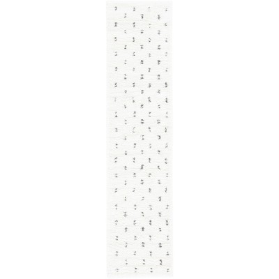 - Modern machine-made area rug in stylish gray and white hues.