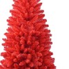 Add some festive spirit to your space with this unique 6-foot red full Christmas tree. This artificial tree boasts a stunning red needle color, creating a bold statement in your holiday decor. With its regular fullness shape, it provides 804 branch tips for hanging ornaments and lights. Designed for stability, it comes with a sturdy metal tree stand that ensures it stays upright throughout the season. Standing at 72 inches tall, it fits perfectly in various spaces, from tabletop to festive entryways, making it an ideal centerpiece for your holiday celebrations. 72.00-inch h x 36.00-inch w x 36.00-inch d.