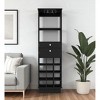 This beautiful accent is made from sturdy MDF that is built to last. Create a mini bar in your living room, dining room, office, lounge, or bedroom with this modern wine cabinet. Featuring a sleek tall and narrow rectangular design, this chic bar cabinet showcases a black finish and open and airy design that effortlessly complements any decor. With two spacious drawers and capacity for twelve wine bottles and six wine glasses, it is perfect for hosting gatherings or displaying your favorite vintages or spirits. 63.2-inch h x 18-inch w x 15.7-inch d.