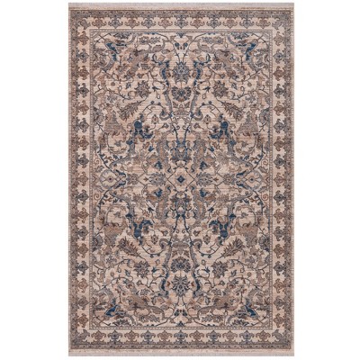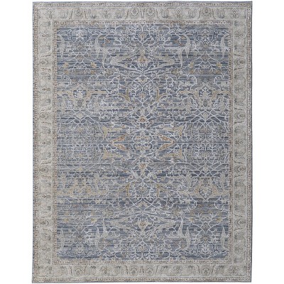 Set an inviting tone in your space with this 7-foot x 10-foot ivory blue and gold floral power loom worn faded area rug with fringe. This rectangle shaped rug features a floral design that will add a functional and decorative accent to your space. Ideal for spaces with kids and pets, this rug is stain resistant to help repel dirt and spilled liquids. Tassel ends bring a timeless and fashionable look to your interior. This larger sized rug is ideal to create a focal point or statement piece in your room. 79-inch h x 114-inch w x 0.43-inch d