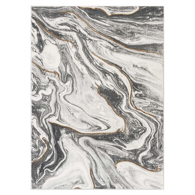 - Modern style area rug in blue and gray polyester material.
