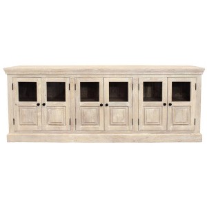 Glass doors give this cabinet a luminous and unique designer touch. Storage vessels don't have to be unsightly. Increase your storage space and the fashion quotient of your room with this hard wearing, versatile, and good looking cabinet. Crafted from solid wood, this sideboard showcases an antiqued white finish that enhances its traditional charm. The purposeful distressing, featuring wood scoring and rub-through techniques, adds character to each piece. With its sturdy shelves and elegant black hardware, this sideboard is both functional and aesthetically pleasing. 36-inch h x 93-inch w x 16-inch d.