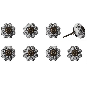 Give your drawers or cabinets a facelift with this set of eight black and white ceramic and metal drawer pull knobs. A favorite of designers and diyer's alike, these high quality round knob traditional style knobs are versatile in use and will change up the look of your existing furniture and cabinetry in a snap. Hand-painted by talented artisans, these knobs will add a touch of artisanal design. 1.5-inch h x 1.5-inch w x 1.5-inch d.