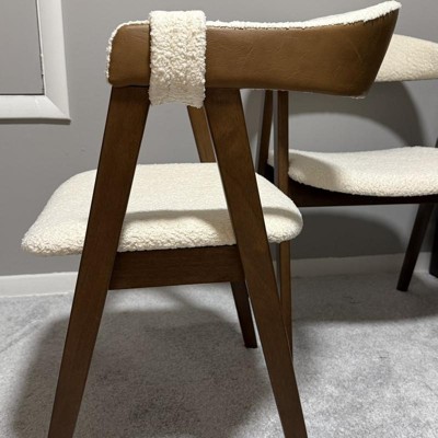 This chair looks beautiful. The brown from the walnut wood leg compliments the white from the boucle so well. The back rest is made of faux leather, I didnt realize its leather until I received the chair. The wooden legs feels luxurious. There are no pre-drilled holes for the L-shape brackets when installing the seat.