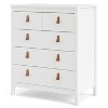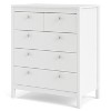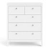 Elevate your bedroom or maximize space with the Madrid 5 Drawer Chest, showcasing a distinctive modern-traditional design perfect for bedroom storage solutions. This chest offers versatile organization with two smaller top drawers and three larger bottom drawers, providing ample space for clothing, accessories, or linens. Customize the look with included grey knobs or brown leather handles, allowing you to personalize the piece to match your decor. The durable foil surface ensures easy cleaning and maintenance, while steel brackets reinforce the larger drawers for added stability. Complete your bedroom ensemble by pairing this chest with other pieces from the Madrid collection.