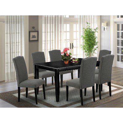 - The fantastic dining table boasts a cement rectangular top paired with sleek black wire-brushed wooden legs, complemented by parson chairs with a black-finished frame, linen fabric seats, and stylish black chair backs, creating an exquisite combination for any room decor style.