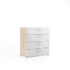 - The Austin 4 Drawer Chest showcases a clean Oak color block finish, bringing a touch of warmth and sophistication to your bedroom or living area, complementing a variety of interior design styles with its neutral and inviting tone.