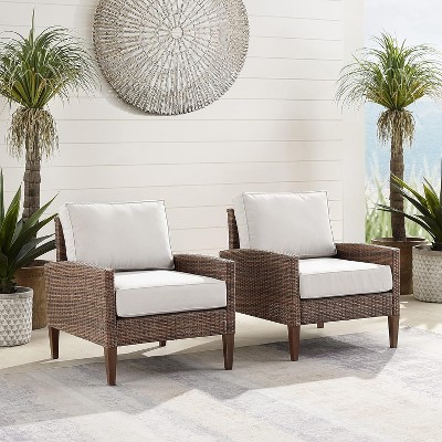 Prepare to lounge and chat away in the Capella Patio Chairs (Set of 2). Blending cool neutral tones with natural finishes, this patio set is a chic upgrade to your outdoor space. All-weather resin wicker and quick-drying olefin fabric come together to create durable outdoor chairs. The classic tapered legs are made from sturdy steel hand-painted to look like real wood, making the Capella chair set a unique outdoor essential.