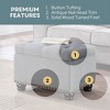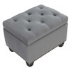 The HomeStock 5th Avenue Storage Ottoman by HomeStock brings style and functionality to any room. This multi-functioning ottoman doubles as extra seating, a footrest, and as a stylish storage unit. A gorgeous button-tufted top, fine stitching, and a beautiful antique nail head trim set this piece apart from the rest. The elegant storage unit offers plenty of space to tuck away blankets, small pillows, and more. A pressure hinge allows for the lid to stay open on its own giving safe and easy access to accessories stored within the ottoman. This contemporary piece is upholstered in a wide variety of luxurious fabrics and filled with padded foam cushions for maximum comfort. The well-built frame is engineered out of durable manufactured wood and supported by carefully crafted solid wood-turned feet. Assembly is simple with this beautiful piece arriving almost fully assembled and only the feet needing to be attached. With a wide variety of luxurious and timeless fabrics to choose from, you are sure to find an ottoman to tie any space together.