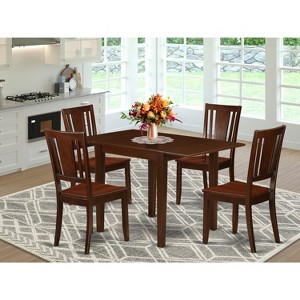 Enhance your dining area with the HomeStock 5-Piece Modern Dining Set, a practical and stylish addition to any home. This set includes a rectangular dining table with convenient drop leaves, offering flexibility for both intimate meals and larger gatherings, complemented by four sturdy and comfortable wooden dining chairs. Constructed from durable Asian hardwood, this dining set provides exceptional stability and longevity, promising years of reliable use. The rich mahogany finish adds a touch of elegance to any decor, while the comfortable wooden seats and supportive panel backs of the chairs ensure a pleasant dining experience. The table's drop leaves allow for adaptable sizing, and the overall design seamlessly blends modern aesthetics with timeless appeal, making it ideal for apartments, condos, or smaller homes.