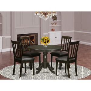 - This versatile 5 piece dinette kitchen table set includes one round table measuring 42 inches in diameter and four chairs with slat backs and comfortable leather seats, all finished in a sophisticated Cappuccino tone to complement any kitchen or dining room decor.