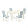 - The dining table features a clean linen white tabletop and legs, complemented by the chairs' baby blue linen fabric seats and linen white legs, creating a cohesive and visually appealing aesthetic.
