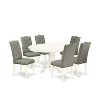 This elegant 7-piece dining room set from HomeStock combines style and functionality for a delightful dining experience. The set includes a round dining table with a Linen White finish and six matching Parson chairs upholstered in a sophisticated Smoke Linen Fabric. Crafted with durable wood and featuring a comfortable, high-back design, this dining set is perfect for both everyday meals and special gatherings. The tables sturdy construction and the chairs plush seating ensure lasting comfort and enjoyment, enhancing the beauty and elegance of any dining space. Easy to assemble, this modern dining set is a fantastic addition to any home.