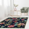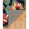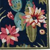 A: The rug showcases a navy blue background adorned with a variety of colorful cactus designs.