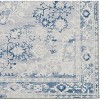 A: The rug features an antique inspired, distressed design with soothing shades of greys and blues.