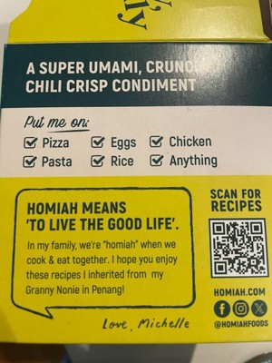 Experience the addictive blend of spicy, savory, and umami flavors of Homiah's Sambal Chili Crunch. Crafted with less oil and less sodium, this is a guilt-free topping that elevates every dish. At the root of incredible flavor are incredible ingredients! Our low sodium, low oil and low cal chili crisp is made from our authentic Malaysian Nonya family recipe using hand sourced ingredients from local farms. Only mildly spicy.