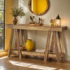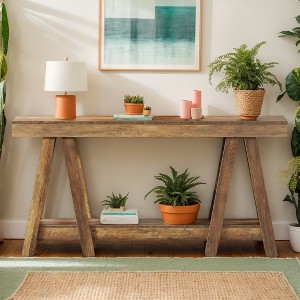 This farmhouse-style entryway table offers rustic charm with its natural wood finish that complements any decor. Constructed with premium MDF and an A-frame design, it is sturdy and durable. The two-tiered design provides ample storage for decor and organization. It is versatile, serving as an entryway table, sofa table, or TV console.