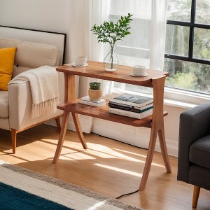 Maximize your space with our modern farmhouse-style tall side table. Constructed from MDF shelves and solid rubber wood legs, it ensures exceptional stability and durability. It features two generous storage shelves to keep your living area organized. The cherry finish and sleek design add a contemporary touch, making it perfect as a sofa side table or bedside nightstand.