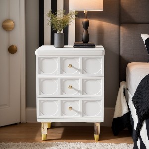 Enhance your bedroom decor with the elegant nightstand, designed to elevate any space. Featuring three spacious drawers for convenient storage and smooth gliding mechanisms for easy access, this nightstand ensures all your bedside essentials are neatly organized.