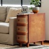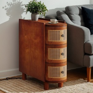 - Boasting an eye-catching blend of natural rattan and a sleek arc design, this end table stands out with its three spacious rattan drawers adorned with metal handles.