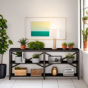 The combination of metal and wood with X-shaped backing gives a rustic aesthetic. 70.9”x11.8” shelving is perfect for your entryway, hallway, bedroom, living room, and home office. Keep clutter out of sight while lending a touch of industrial-chic look and rustic appeal to your space. You can use this clean-lined table as a bar table, sofa table behind your couch, an entryway console table, or accent table. The versatile appearance makes it perfect to be a TV stand or a long horizontal bookshelf. Meet all your display and storage needs.This console table featuring three open shelves offers ample space for convenient storage and display, saving space and making your home tidy. It is long enough to stretch your couch and set down books, plants, frame photos, and home decorations.