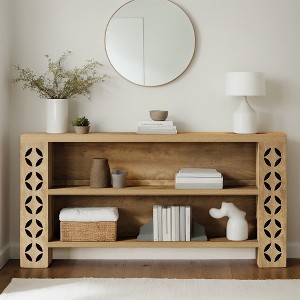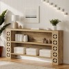 This console table features a timeless design with warm, natural wood grain and sophisticated geometric patterns. It offers three tiers of storage for ample organization, with the tabletop perfect for decorations and the two lower shelves for books and other items. Versatile and functional, it can serve as a TV stand, sofa table, or entry table.