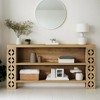 - This console table features a warm, natural wood grain combined with a sophisticated geometric design, adding timeless elegance to any room.