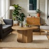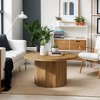 This round coffee table pairs a fluted pedestal base with a smooth wood top for mid-century charm. The compact circle saves floor space, the sturdy core handles heavy use, and assembly finishes in moments—add sculptural centerpiece elegance to any lounge today.
