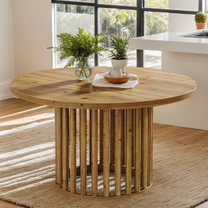 - Solid-wood round top paired with a hollow cylindrical base delivers a striking farmhouse-modern silhouette that anchors living rooms without visual bulk.
