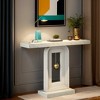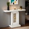 The Modern Console Table features a unique geometric base design that adds a touch of elegance to any living room, hallway, or entryway. The golden ball decor adds a sophisticated touch to the design. Measuring at just 39.4 inches, this narrow sofa entryway table boasts a modern and minimalist design that complements any living space. It is the perfect size for smaller entryways or as an accent table in larger living rooms. The faux marble top of the table is scratch-resistant and easy to clean, making it a practical choice for households with busy lifestyles. The delicate veining and smooth surface of the top add to the overall design aesthetic. Crafted with high-quality MDF Board, this console table is durable and sturdy, ensuring it will last for years to come. The wood is finished with an immaculate white gloss for a modern look that matches any home decor. Whether it's used as a statement piece in a contemporary living room, a handy place for keys and mail in the entryway, or a decorative piece in a hallway, the Modern Console Table is a versatile piece of furniture that is both practical and stylish.